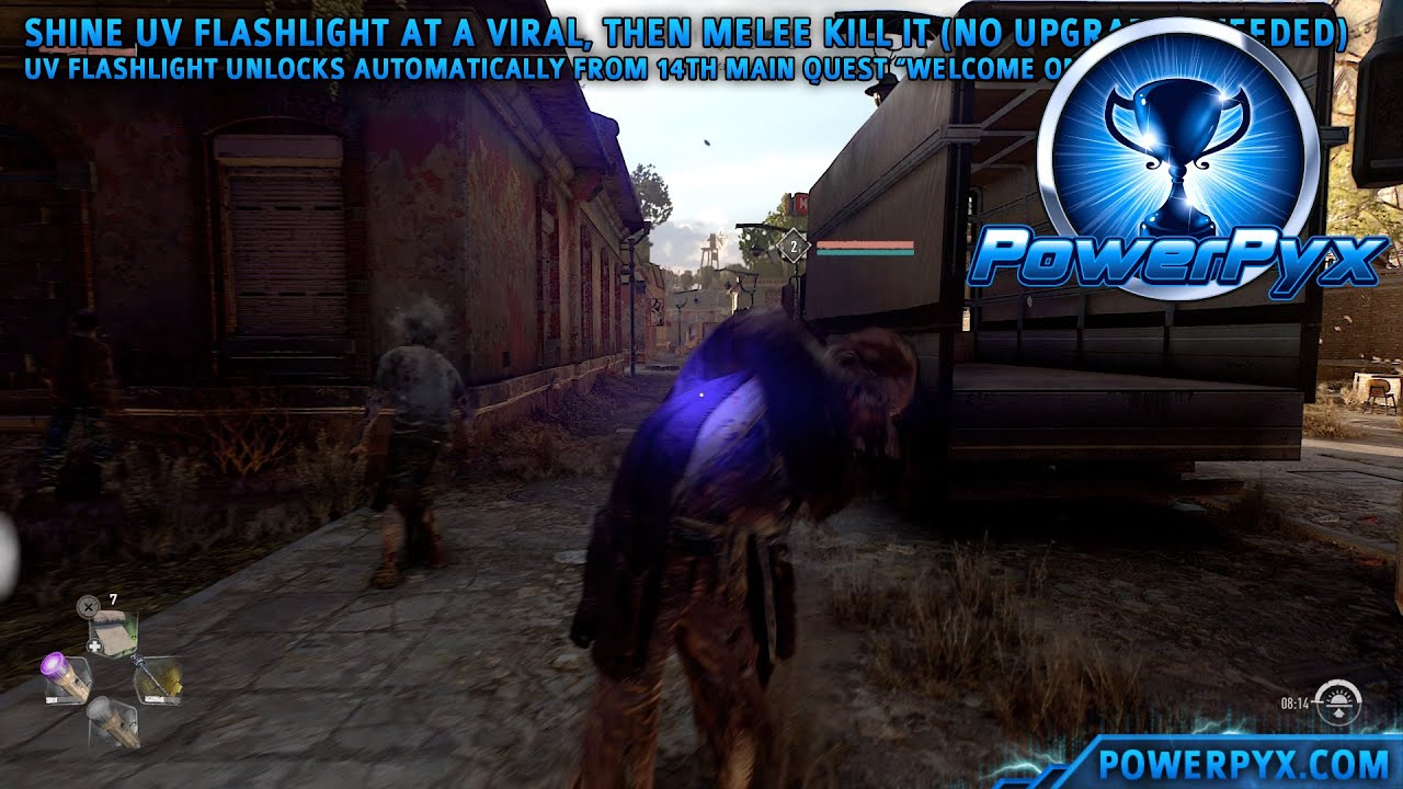 Go find any of the normal slow zombies that walk around in the streets at day (trophy wouldn’t unlock at night for me for some reason). Virals are the most common, slowest form of infected, found everywhere in the streets. Shine the UV flashlight at one of them, then perform a melee-attack to kill the Viral while it is stunned from the UV light.