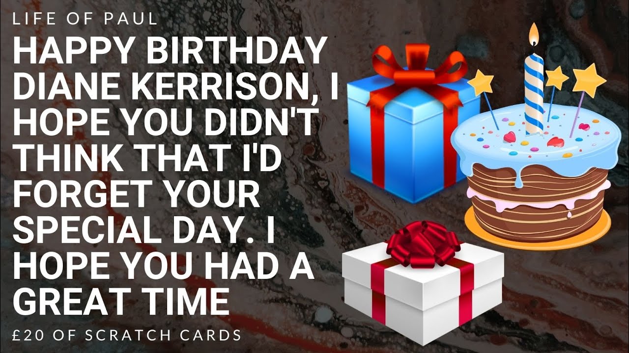 Happy birthday Diane Kerrison, £20 mix of £5 scratch cards for you to enjoy on your special day. I hope that you get spoilt rotten and that you have a nice relaxing day. All the best, Paul.