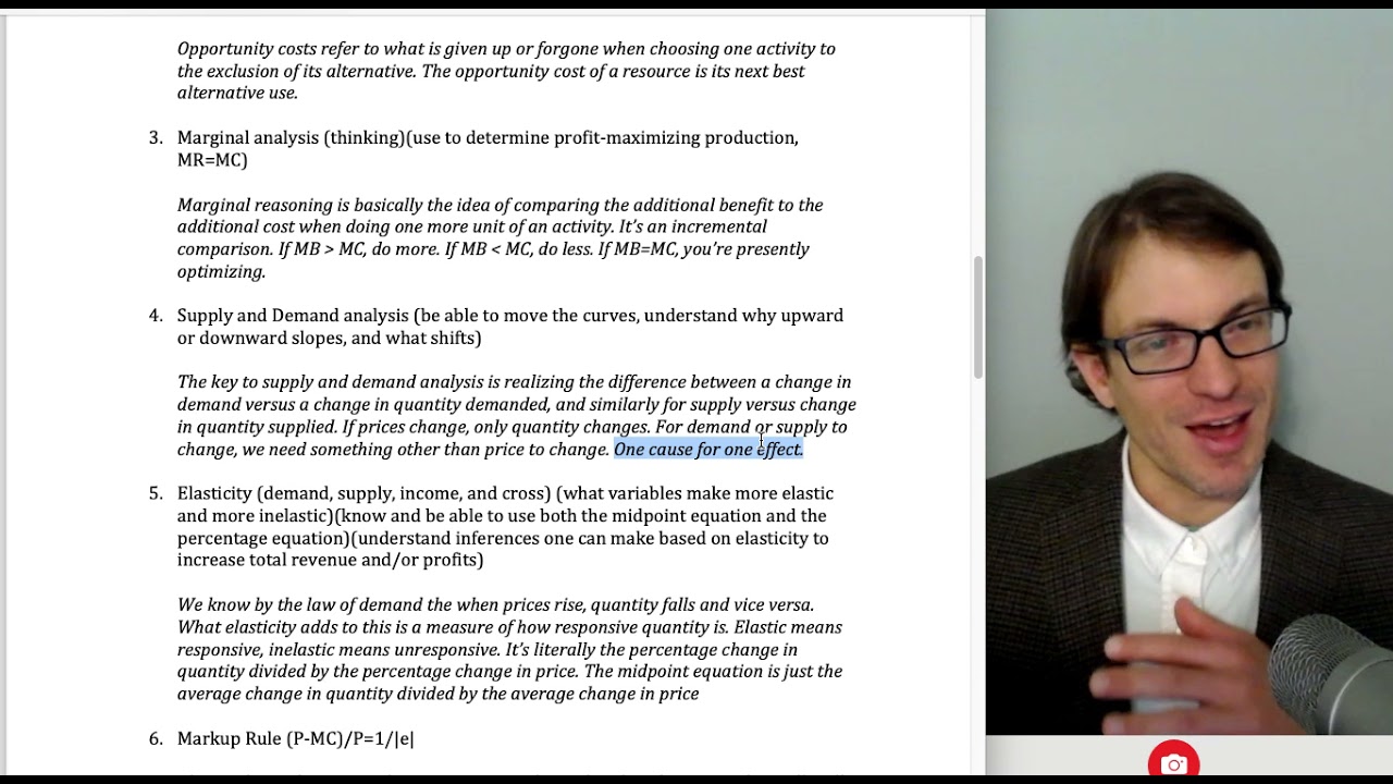 | Key microeconomic concepts: 1. Concept of highest value use 2. Opportunity Cost 3. Marginal analysis (thinking)(use to determine profit-maximizing production, MR=MC) 4. Supply and Demand analysis (be able to move the curves, understand why upward or downward slopes, and what shifts) 5. Elasticity (demand, supply, income, and cross) (what variables make more elastic and more inelastic)(know and be able to use both the midpoint equation and the percentage equation)(understand inferences one can make based on elasticity to increase total revenue and/or profits) 6. Markup Rule (P-MC)/P=1/ |