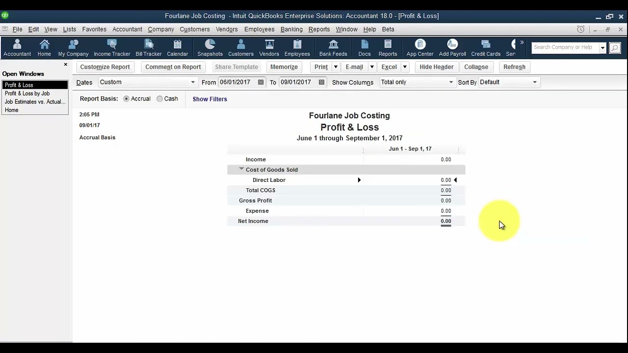 Now that we have posted the actual costs into the file, we will show you the results with actual job costs posted. We will use the estimate vs actual summary report as well as the Profit and Loss by Job to be sure our costs went in as planned. We will also see the overall affect of our entries on the financials.
