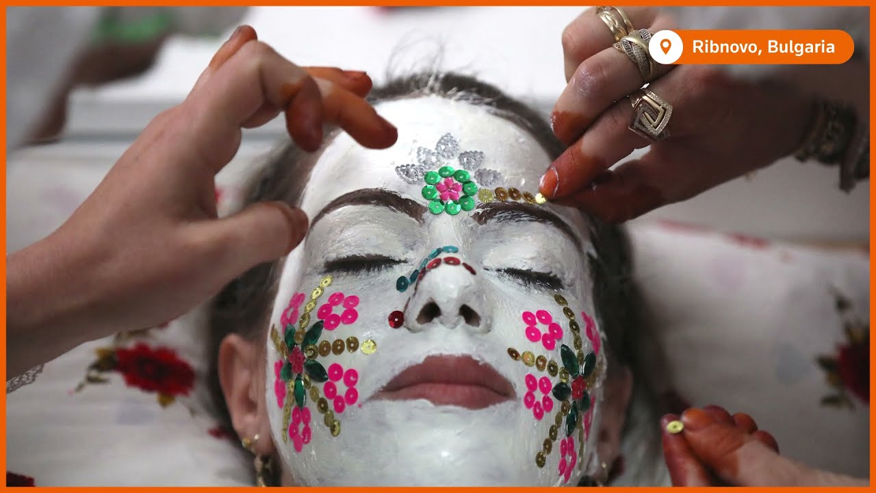 Here’s a look at scenes from a wedding ritual in Bulgaria where the bride’s face is covered in thick, chalky white paint and colorful sequins
