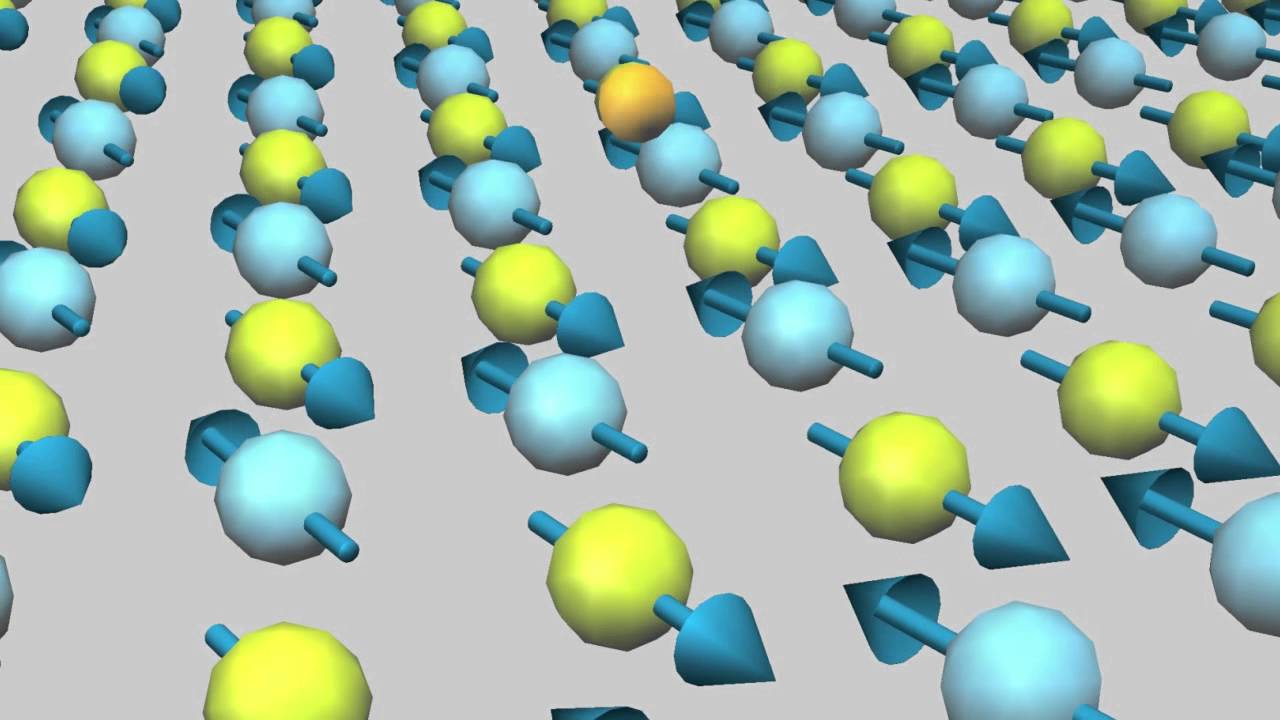 This animation shows spin waves propagating through an antiferromagnetic material, in which neighboring atoms (balls) have opposite spins (arrows). When a photon, or light particle (gold ball), of the right wavelength hits an atom and perturbs its spin, the disturbance spreads like ripples in water. These spin waves can be detected with a technique called RIXS, which analyzes the energy and momentum of photons emitted by the disturbed material. An international study led by Stanford and SLAC scientists has found unusual behaviors of spin waves in a superconducting copper oxide material. The next step is to see whether and how this new excitation is related to the material’s ability to conduct electricity with 100 percent efficiency. (SLAC National Accelerator Laboratory, Neutrons4Science)