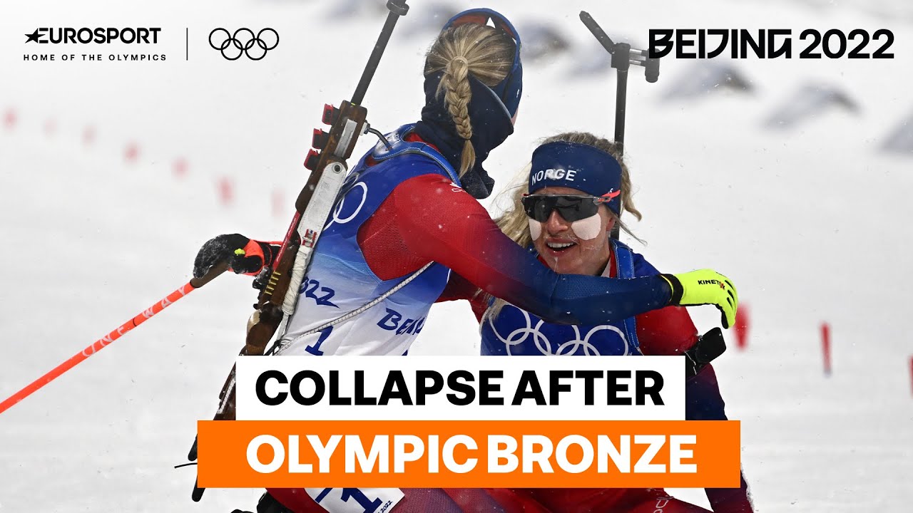 Tiril Eckhoff drops to the floor after winning bronze for Norway in the Women’s Biathlon 10km Pursuit in the 2022 Winter Olympics