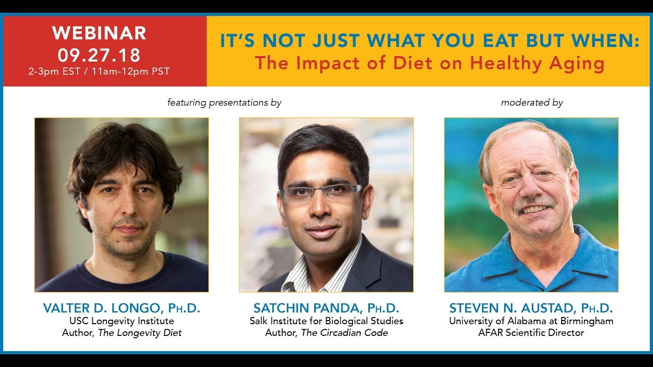 AFAR experts Valter Longo, Ph.D. and Satchin Panda, Ph.D. presented on caloric restriction, the fasting-mimicking diet, and the circadian code. AFAR Scientific Director Steven Austad, Ph.D. moderated the webinar and Q&A.